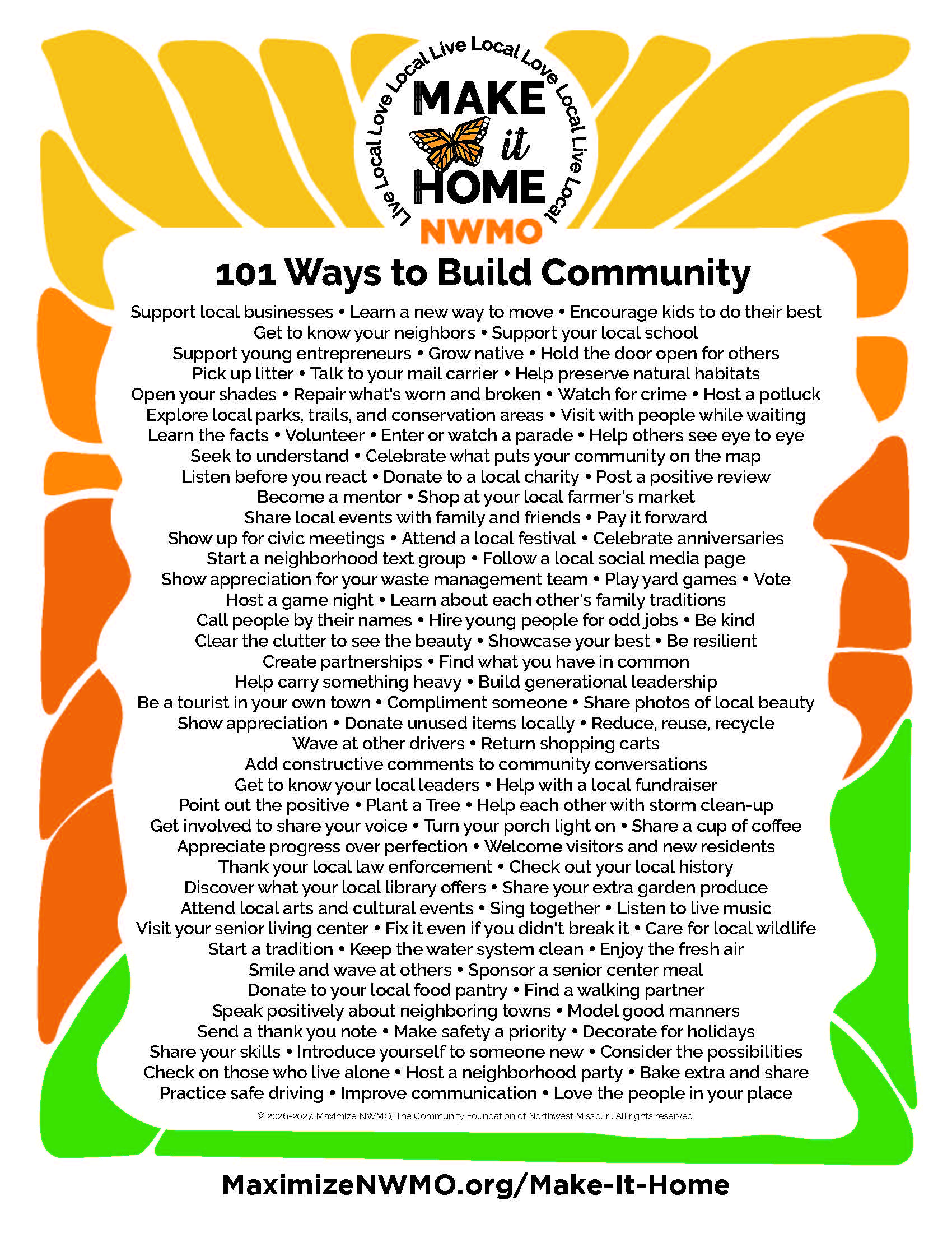 Thanks to the help of our regional Communications CollaborACTION Team of volunteers, support team through JUPER Communications, and the generosity of the Patterson Family Foundation, Maximize NWMO, the regional vitality initiative of The Community Foundation of Northwest Missouri, will be sharing a weekly post featuring 101 Ways to Build Community throughout 2026 and 2027.